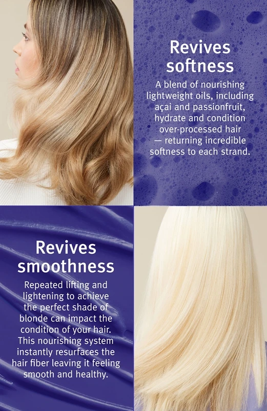 Maintenez votre blond de glace sans reflets cuivrés ou jaunes ! L’après–shampoing violet Aveda Revival™ Purple Toning Conditioner garde vos cheveux tout aussi parfaits. Il est rempli de pigments violets qui neutralisent avec succès toute coloration indésirable. Et ce n’est pas tout, grâce à ses huiles légères et nourrissantes, il garde vos cheveux blonds parfaitement doux et brillants. Éblouissants à première vue.