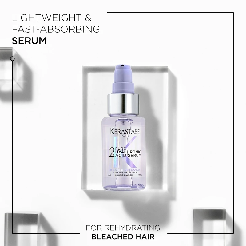 Offrez le soin nécessaire à vos cheveux blonds abîmés par les décolorations. Le sérum capillaire à l’acide hyaluronique Kérastase Blond Absolu 2 % Pure Hyaluronic Acid procure aux cheveux une hydratation immédiate, les nourrit et leur évite de se casser. Il apaise également le cuir chevelu et favorise son renouvellement. Après utilisation, les cheveux sont plus forts, plus brillants, mieux protégés contre les agressions extérieures.