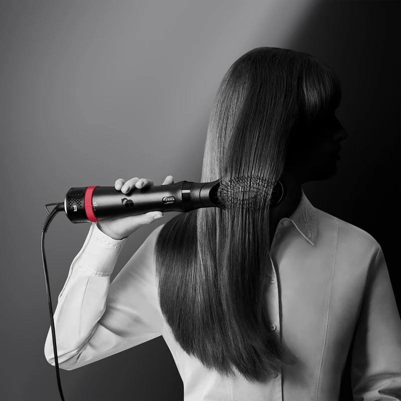 Sélectionnez l’accessoire de votre choix et fixez-le à la tête. Branchez-le sur le secteur et allumez-le. Réglez la température, la vitesse et le débit d’air souhaités en fonction de vos cheveux. Passez délicatement vos cheveux par des mouvements doux, selon les besoins de la coiffure finale. Respectez à tout moment les informations contenues dans les instructions.